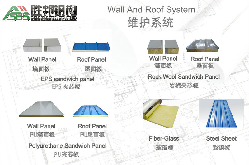 The steel structure panel material included EPS sandwich panel,Rock wool sandwich panel,PU sandwich panel,fiber-glass ,steel sheet